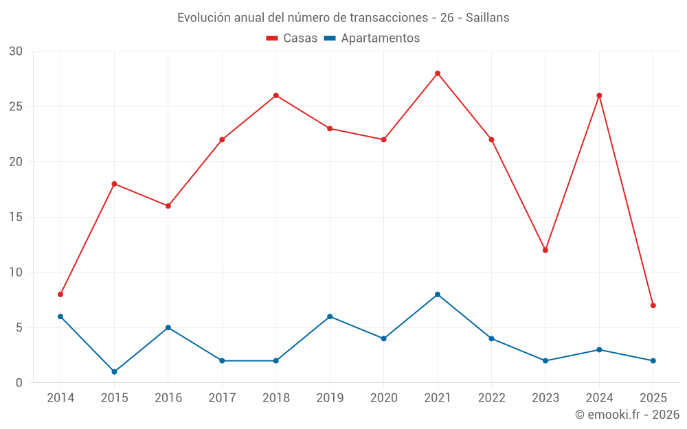 El precio mediano en las 19 transacciones de casas de los últimos 12 meses en la comuna de Saillans fue de 2 610 € por metro cuadrado para un valor patrimonial medio de 204 000 €. Durante este período el 60% de las transacciones estuvieron entre 1 798 y 3 186 € por metro cuadrado (del 2º al 8º decil).