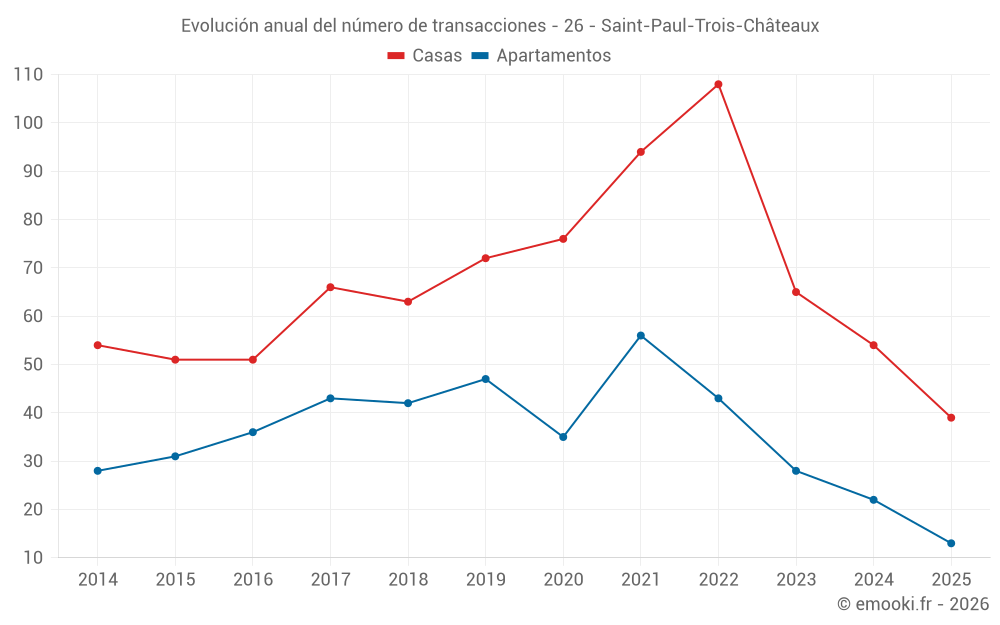 El precio mediano en las 22 transacciones de casas de los últimos 3 meses en la comuna de Saint-Paul-Trois-Châteaux fue de 2 332 € por metro cuadrado para un valor patrimonial medio de 237 500 €. Durante este período el 60% de las transacciones estuvieron entre 1 945 y 2 819 € por metro cuadrado (del 2º al 8º decil).