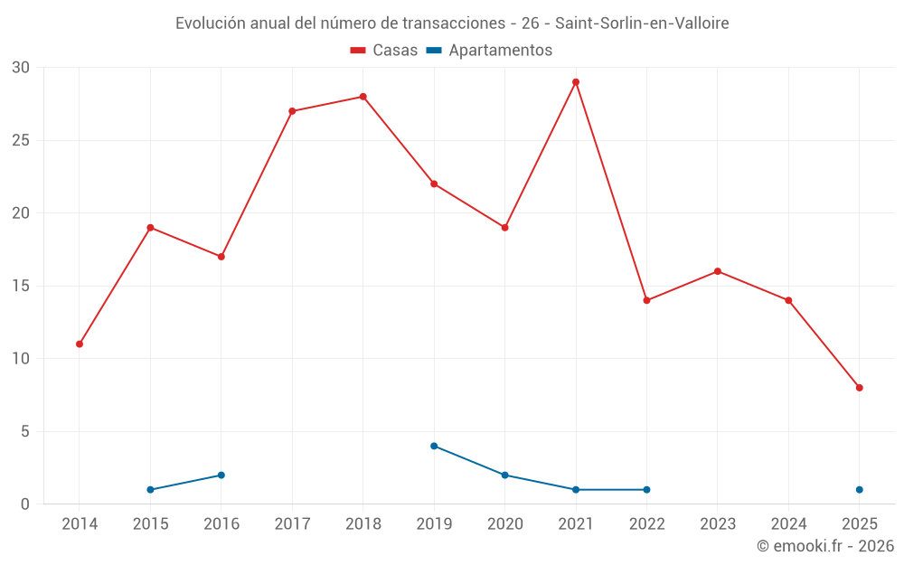 El precio mediano en las 18 transacciones de casas de los últimos 12 meses en la comuna de Saint-Sorlin-en-Valloire fue de 2 061 € por metro cuadrado para un valor patrimonial medio de 190 000 €. Durante este período el 60% de las transacciones estuvieron entre 1 392 y 2 745 € por metro cuadrado (del 2º al 8º decil).