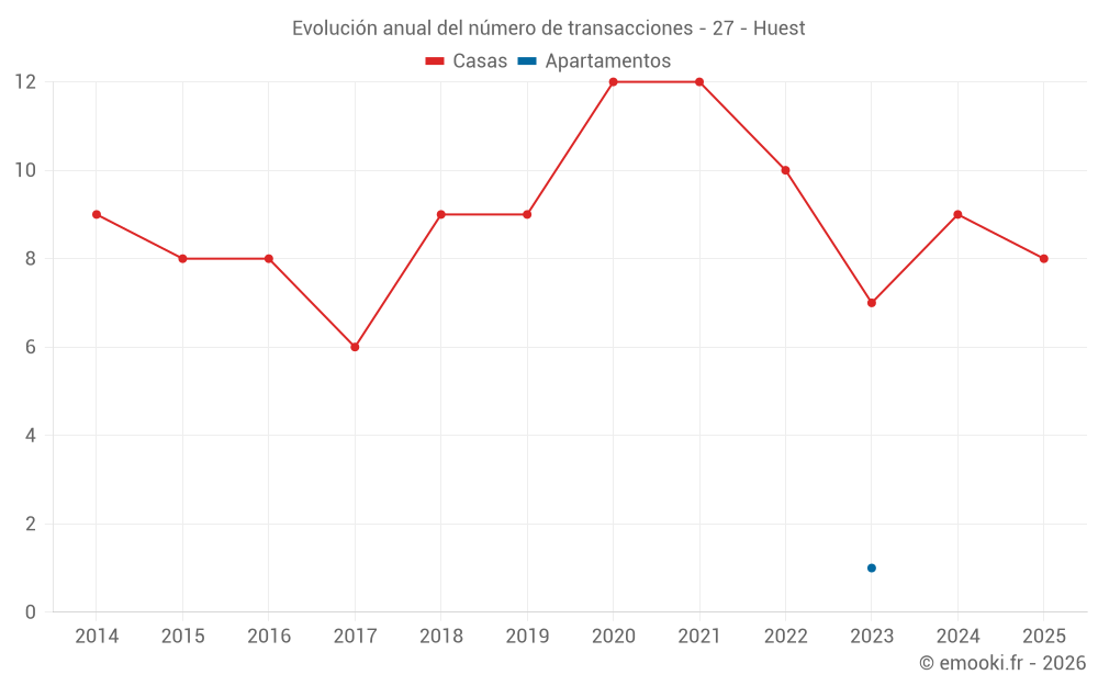El precio mediano en las 23 transacciones de casas de los últimos 24 meses en la comuna de Huest fue de 1 778 € por metro cuadrado para un valor patrimonial medio de 226 450 €. Durante este período el 60% de las transacciones estuvieron entre 1 435 y 2 345 € por metro cuadrado (del 2º al 8º decil).
