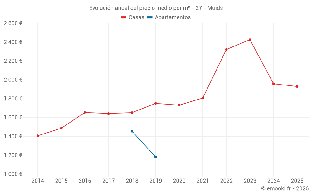 El precio mediano en las 17 transacciones de casas de los últimos 24 meses en la comuna de Muids fue de 1 994 € por metro cuadrado para un valor patrimonial medio de 176 000 €. Durante este período el 60% de las transacciones estuvieron entre 1 610 y 2 751 € por metro cuadrado (del 2º al 8º decil).