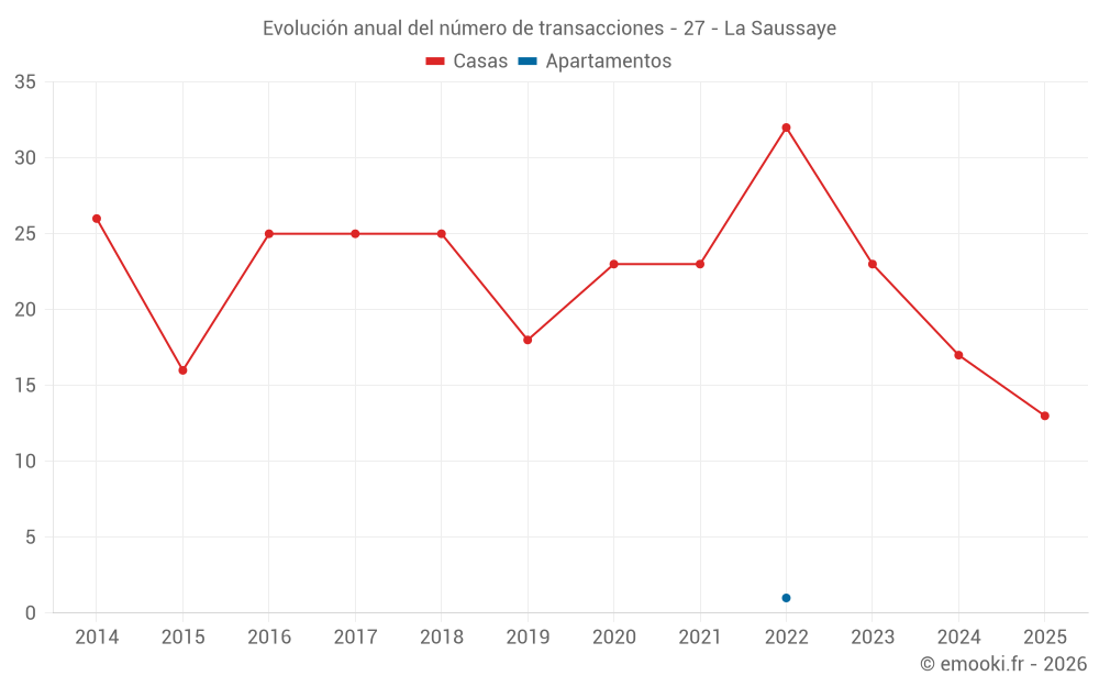 El precio mediano en las 21 transacciones de casas de los últimos 12 meses en la comuna de La Saussaye fue de 2 069 € por metro cuadrado para un valor patrimonial medio de 190 000 €. Durante este período el 60% de las transacciones estuvieron entre 1 589 y 2 491 € por metro cuadrado (del 2º al 8º decil).