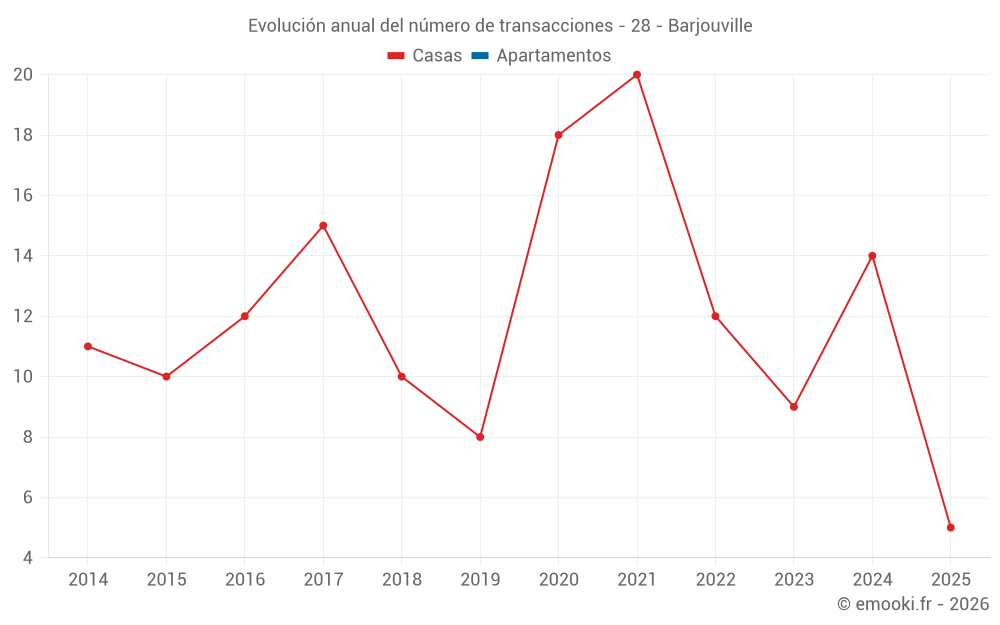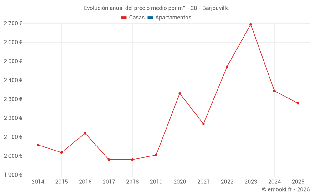 El precio mediano en las 26 transacciones de casas de los últimos 24 meses en la comuna de Barjouville fue de 2 560 € por metro cuadrado para un valor patrimonial medio de 238 000 €. Durante este período el 60% de las transacciones estuvieron entre 2 031 y 3 125 € por metro cuadrado (del 2º al 8º decil).