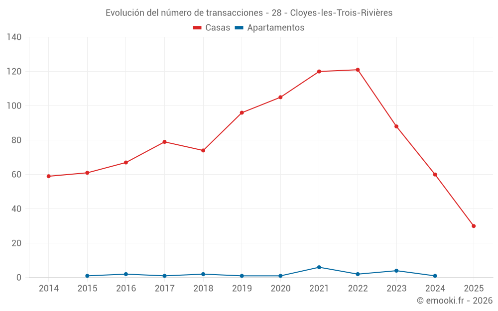 El precio mediano en las 30 transacciones de casas de los últimos 6 meses en la comuna de Cloyes-les-Trois-Rivières fue de 1 276 € por metro cuadrado para un valor patrimonial medio de 123 185 €. Durante este período el 60% de las transacciones estuvieron entre 829 y 1 605 € por metro cuadrado (del 2º al 8º decil).