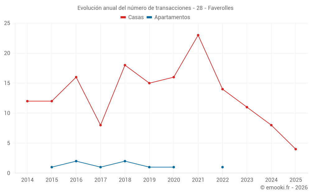 El precio mediano en las 16 transacciones de casas de los últimos 24 meses en la comuna de Faverolles fue de 2 289 € por metro cuadrado para un valor patrimonial medio de 262 350 €. Durante este período el 60% de las transacciones estuvieron entre 1 771 y 2 667 € por metro cuadrado (del 2º al 8º decil).