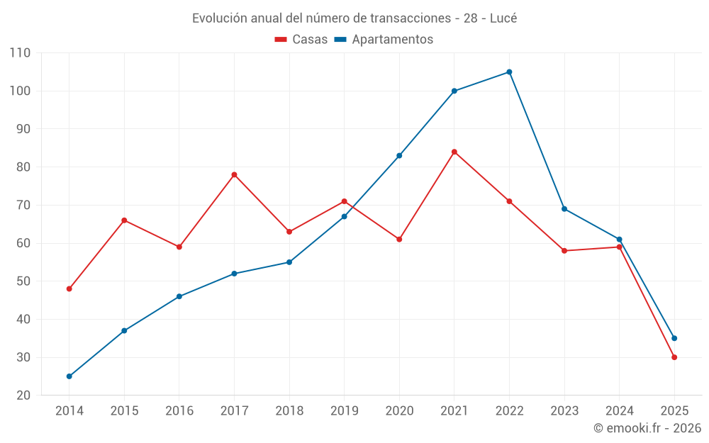 El precio mediano en las 35 transacciones de apartamentos de los últimos 6 meses en la comuna de Lucé fue de 2 212 € por metro cuadrado para un valor patrimonial medio de 108 000 €. Durante este período el 60% de las transacciones estuvieron entre 1 887 y 2 768 € por metro cuadrado (del 2º al 8º decil).