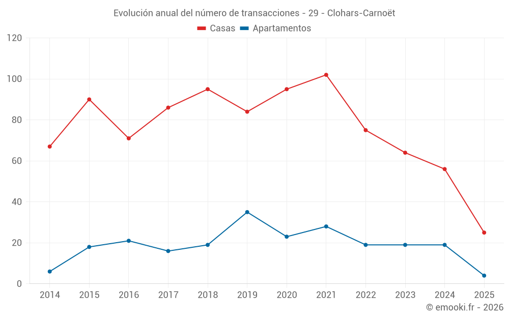 El precio mediano en las 25 transacciones de casas de los últimos 6 meses en la comuna de Clohars-Carnoët fue de 3 102 € por metro cuadrado para un valor patrimonial medio de 340 000 €. Durante este período el 60% de las transacciones estuvieron entre 2 285 y 3 918 € por metro cuadrado (del 2º al 8º decil).