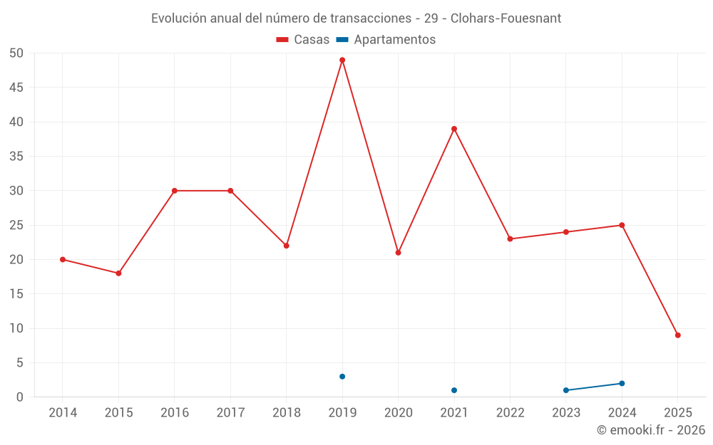 El precio mediano en las 26 transacciones de casas de los últimos 12 meses en la comuna de Clohars-Fouesnant fue de 2 624 € por metro cuadrado para un valor patrimonial medio de 257 500 €. Durante este período el 60% de las transacciones estuvieron entre 2 011 y 3 021 € por metro cuadrado (del 2º al 8º decil).
