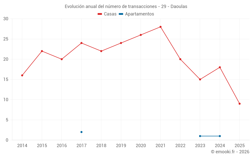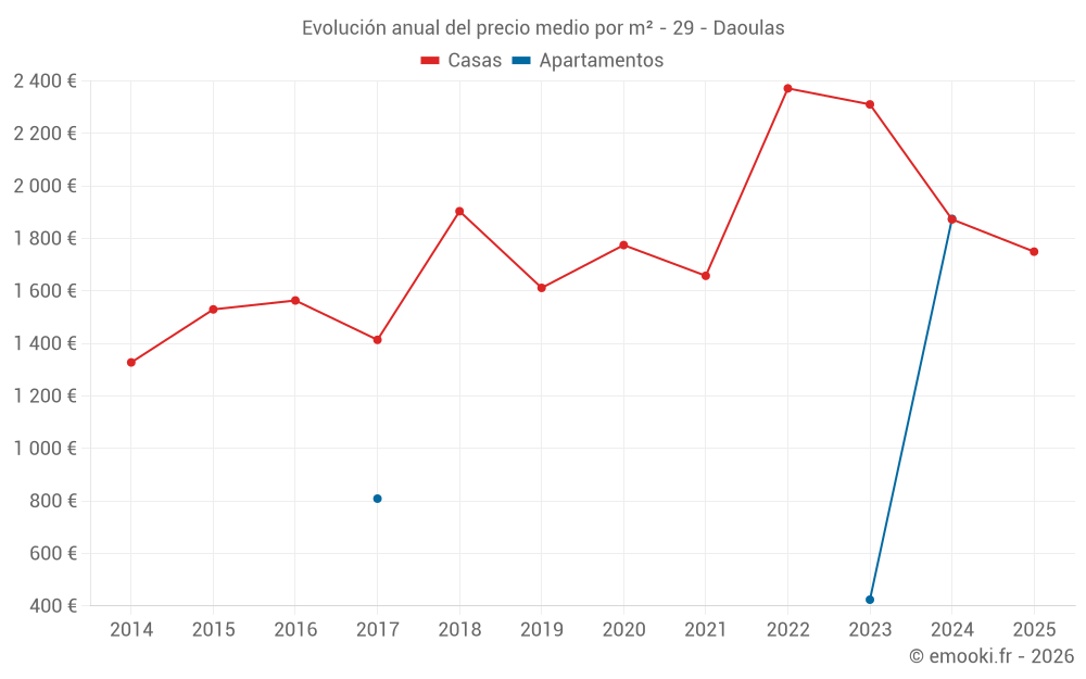 El precio mediano en las 23 transacciones de casas de los últimos 12 meses en la comuna de Daoulas fue de 1 950 € por metro cuadrado para un valor patrimonial medio de 198 000 €. Durante este período el 60% de las transacciones estuvieron entre 1 524 y 2 384 € por metro cuadrado (del 2º al 8º decil).