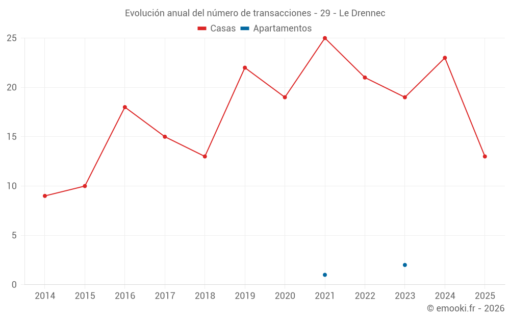 El precio mediano en las 22 transacciones de casas de los últimos 12 meses en la comuna de Le Drennec fue de 2 032 € por metro cuadrado para un valor patrimonial medio de 187 500 €. Durante este período el 60% de las transacciones estuvieron entre 1 378 y 2 316 € por metro cuadrado (del 2º al 8º decil).