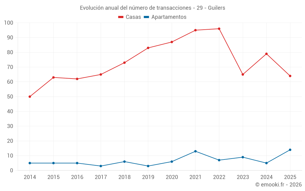 El precio mediano en las 25 transacciones de casas de los últimos 6 meses en la comuna de Guilers fue de 2 435 € por metro cuadrado para un valor patrimonial medio de 240 000 €. Durante este período el 60% de las transacciones estuvieron entre 1 859 y 2 951 € por metro cuadrado (del 2º al 8º decil).