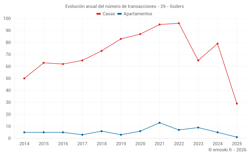 El precio mediano en las 29 transacciones de casas de los últimos 6 meses en la comuna de Guilers fue de 2 318 € por metro cuadrado para un valor patrimonial medio de 244 000 €. Durante este período el 60% de las transacciones estuvieron entre 1 808 y 2 994 € por metro cuadrado (del 2º al 8º decil).