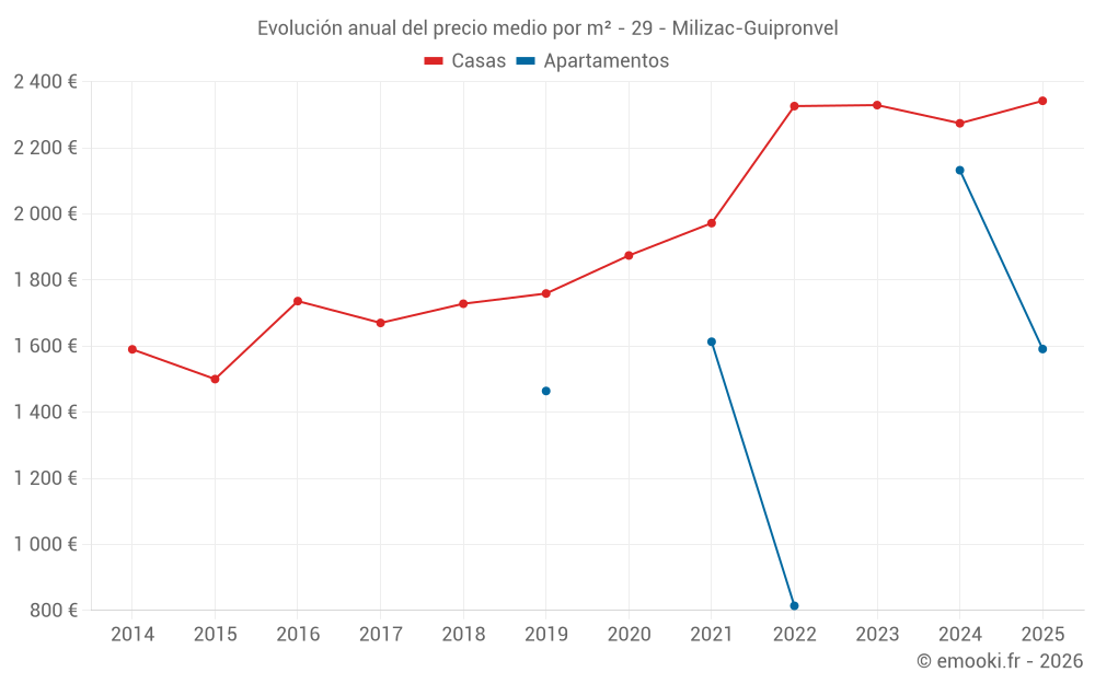 El precio mediano en las 24 transacciones de casas de los últimos 6 meses en la comuna de Milizac-Guipronvel fue de 2 342 € por metro cuadrado para un valor patrimonial medio de 271 060 €. Durante este período el 60% de las transacciones estuvieron entre 2 062 y 2 913 € por metro cuadrado (del 2º al 8º decil).