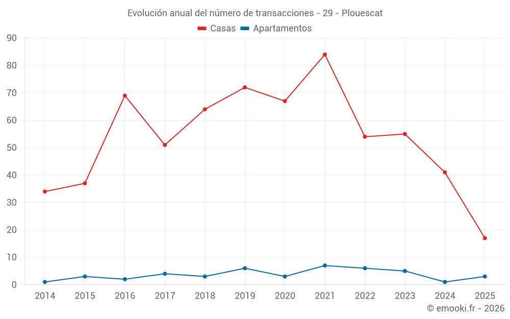 El precio mediano en las 41 transacciones de casas de los últimos 12 meses en la comuna de Plouescat fue de 1 923 € por metro cuadrado para un valor patrimonial medio de 195 150 €. Durante este período el 60% de las transacciones estuvieron entre 1 366 y 2 955 € por metro cuadrado (del 2º al 8º decil).