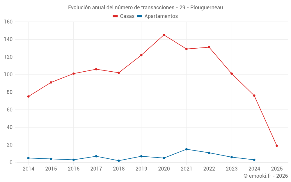 El precio mediano en las 19 transacciones de casas de los últimos 6 meses en la comuna de Plouguerneau fue de 2 321 € por metro cuadrado para un valor patrimonial medio de 190 000 €. Durante este período el 60% de las transacciones estuvieron entre 1 683 y 3 380 € por metro cuadrado (del 2º al 8º decil).