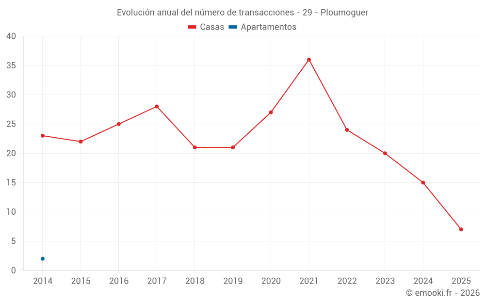 El precio mediano en las 34 transacciones de casas de los últimos 24 meses en la comuna de Ploumoguer fue de 2 446 € por metro cuadrado para un valor patrimonial medio de 227 348 €. Durante este período el 60% de las transacciones estuvieron entre 1 869 y 3 044 € por metro cuadrado (del 2º al 8º decil).