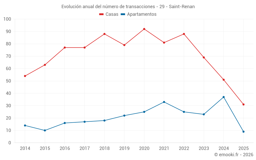 El precio mediano en las 31 transacciones de casas de los últimos 6 meses en la comuna de Saint-Renan fue de 2 525 € por metro cuadrado para un valor patrimonial medio de 267 900 €. Durante este período el 60% de las transacciones estuvieron entre 2 090 y 2 883 € por metro cuadrado (del 2º al 8º decil).