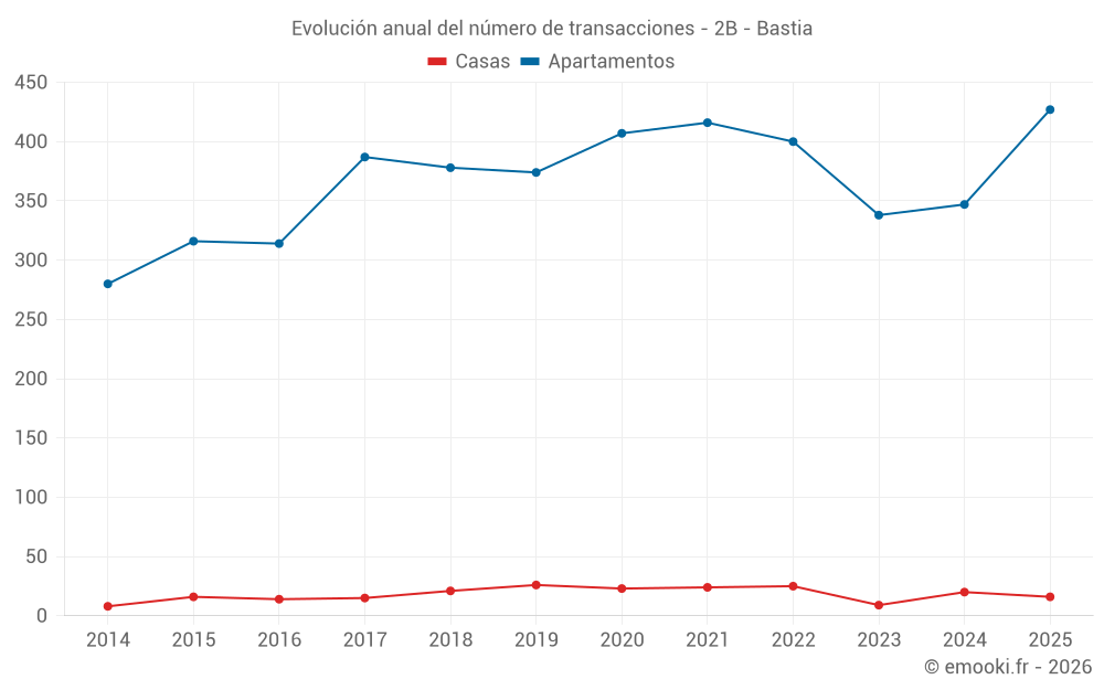 El precio mediano en las 118 transacciones de apartamentos de los últimos 3 meses en la comuna de Bastia fue de 2 608 € por metro cuadrado para un valor patrimonial medio de 161 234 €. Durante este período el 60% de las transacciones estuvieron entre 1 972 y 3 434 € por metro cuadrado (del 2º al 8º decil).