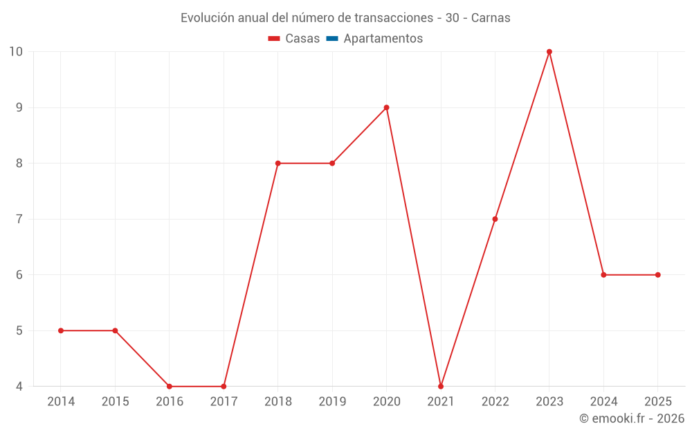 El precio mediano en las 16 transacciones de casas de los últimos 24 meses en la comuna de Carnas fue de 2 388 € por metro cuadrado para un valor patrimonial medio de 280 450 €. Durante este período el 60% de las transacciones estuvieron entre 1 818 y 3 391 € por metro cuadrado (del 2º al 8º decil).