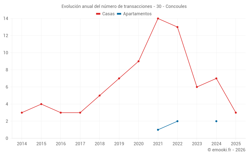 El precio mediano en las 14 transacciones de casas de los últimos 24 meses en la comuna de Concoules fue de 1 572 € por metro cuadrado para un valor patrimonial medio de 90 595 €. Durante este período el 60% de las transacciones estuvieron entre 1 234 y 2 067 € por metro cuadrado (del 2º al 8º decil).