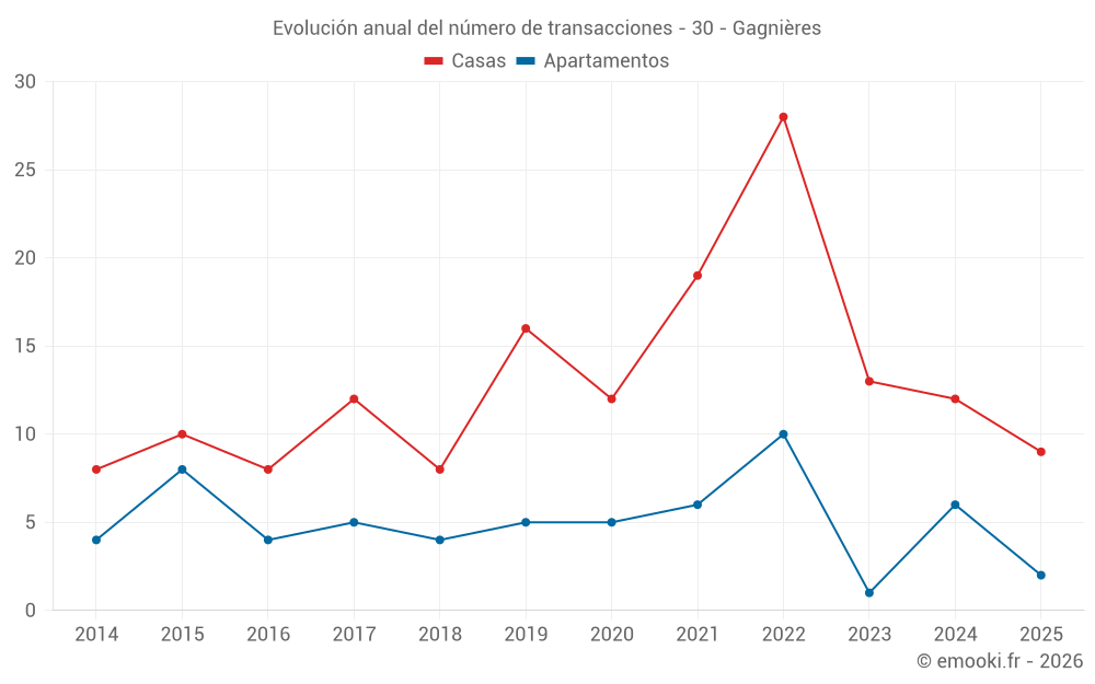 El precio mediano en las 29 transacciones de casas de los últimos 24 meses en la comuna de Gagnières fue de 2 070 € por metro cuadrado para un valor patrimonial medio de 200 000 €. Durante este período el 60% de las transacciones estuvieron entre 1 344 y 2 381 € por metro cuadrado (del 2º al 8º decil).