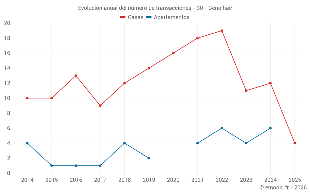 El precio mediano en las 23 transacciones de casas de los últimos 24 meses en la comuna de Génolhac fue de 1 514 € por metro cuadrado para un valor patrimonial medio de 120 000 €. Durante este período el 60% de las transacciones estuvieron entre 1 016 y 2 091 € por metro cuadrado (del 2º al 8º decil).