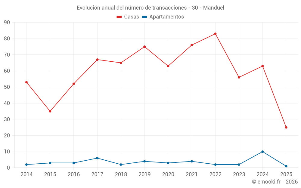 El precio mediano en las 25 transacciones de casas de los últimos 6 meses en la comuna de Manduel fue de 2 781 € por metro cuadrado para un valor patrimonial medio de 300 000 €. Durante este período el 60% de las transacciones estuvieron entre 2 277 y 3 417 € por metro cuadrado (del 2º al 8º decil).