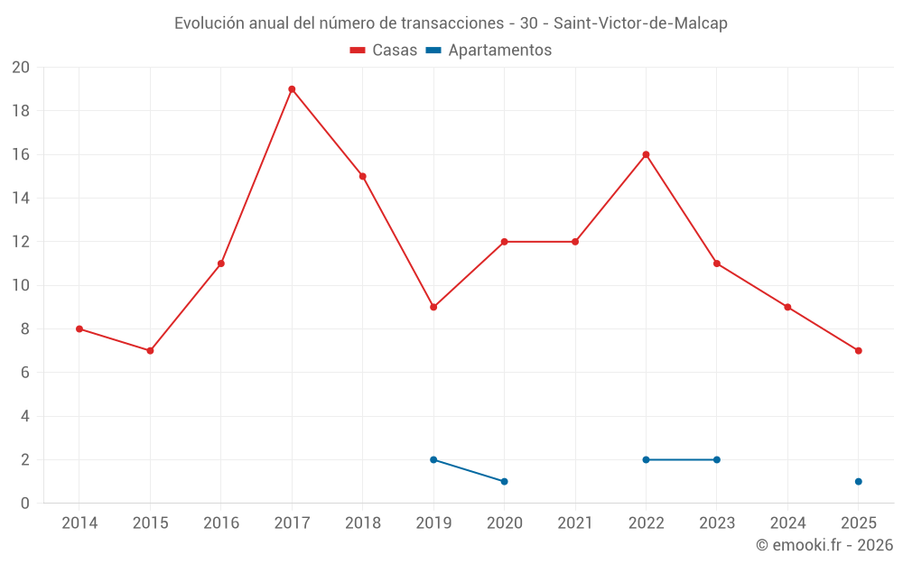 El precio mediano en las 22 transacciones de casas de los últimos 24 meses en la comuna de Saint-Victor-de-Malcap fue de 2 170 € por metro cuadrado para un valor patrimonial medio de 238 000 €. Durante este período el 60% de las transacciones estuvieron entre 1 650 y 2 860 € por metro cuadrado (del 2º al 8º decil).