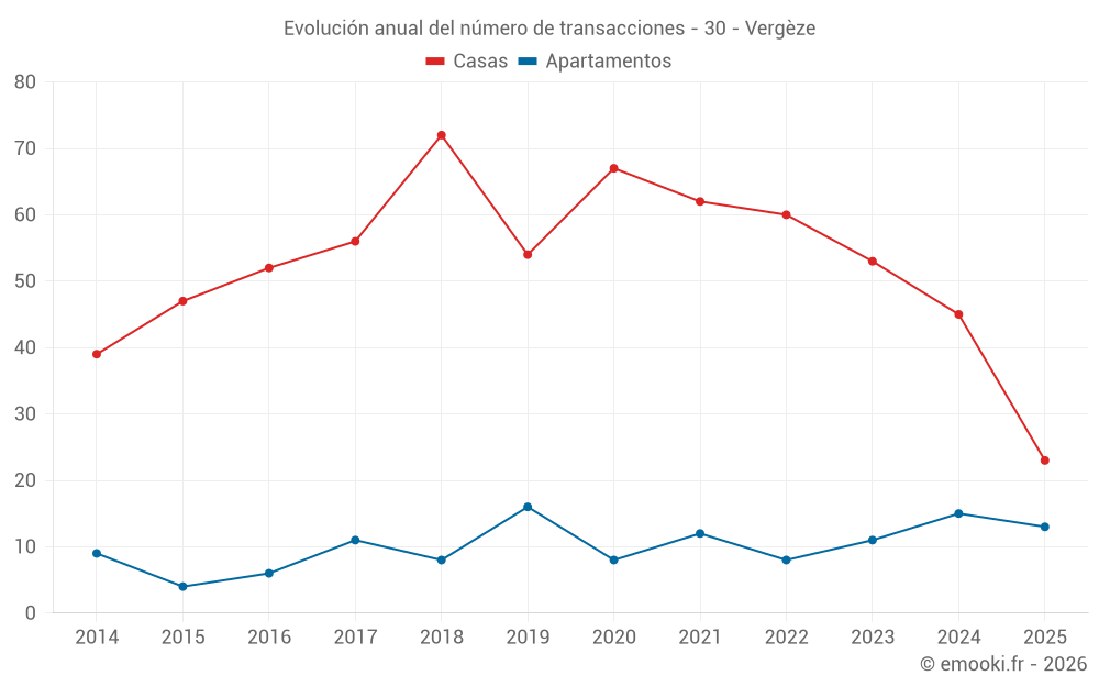 El precio mediano en las 23 transacciones de apartamentos de los últimos 12 meses en la comuna de Vergèze fue de 2 625 € por metro cuadrado para un valor patrimonial medio de 195 000 €. Durante este período el 60% de las transacciones estuvieron entre 2 131 y 3 065 € por metro cuadrado (del 2º al 8º decil).