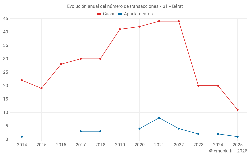El precio mediano en las 23 transacciones de casas de los últimos 12 meses en la comuna de Bérat fue de 2 321 € por metro cuadrado para un valor patrimonial medio de 247 500 €. Durante este período el 60% de las transacciones estuvieron entre 1 794 y 2 733 € por metro cuadrado (del 2º al 8º decil).