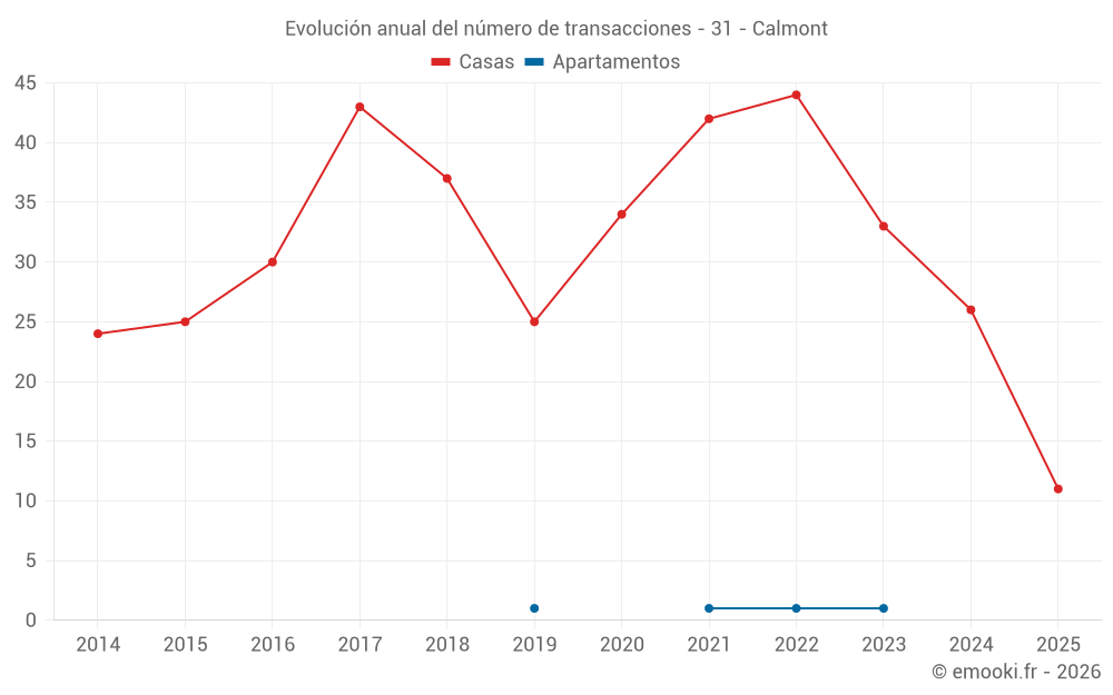 El precio mediano en las 23 transacciones de casas de los últimos 12 meses en la comuna de Calmont fue de 2 140 € por metro cuadrado para un valor patrimonial medio de 225 000 €. Durante este período el 60% de las transacciones estuvieron entre 1 354 y 2 602 € por metro cuadrado (del 2º al 8º decil).