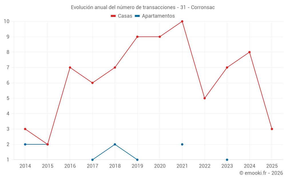 El precio mediano en las 15 transacciones de casas de los últimos 24 meses en la comuna de Corronsac fue de 3 273 € por metro cuadrado para un valor patrimonial medio de 421 900 €. Durante este período el 60% de las transacciones estuvieron entre 2 802 y 3 672 € por metro cuadrado (del 2º al 8º decil).