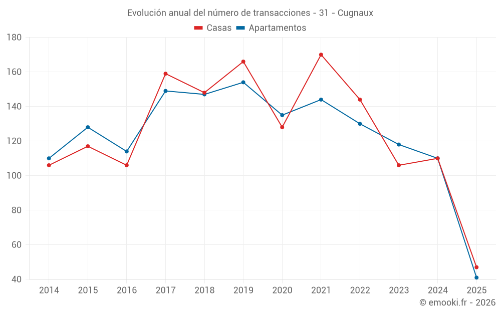 El precio mediano en las 47 transacciones de casas de los últimos 6 meses en la comuna de Cugnaux fue de 2 762 € por metro cuadrado para un valor patrimonial medio de 264 400 €. Durante este período el 60% de las transacciones estuvieron entre 2 452 y 3 265 € por metro cuadrado (del 2º al 8º decil).