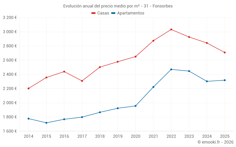 El precio mediano en las 27 transacciones de casas de los últimos 6 meses en la comuna de Fonsorbes fue de 2 708 € por metro cuadrado para un valor patrimonial medio de 261 500 €. Durante este período el 60% de las transacciones estuvieron entre 2 333 y 3 177 € por metro cuadrado (del 2º al 8º decil).