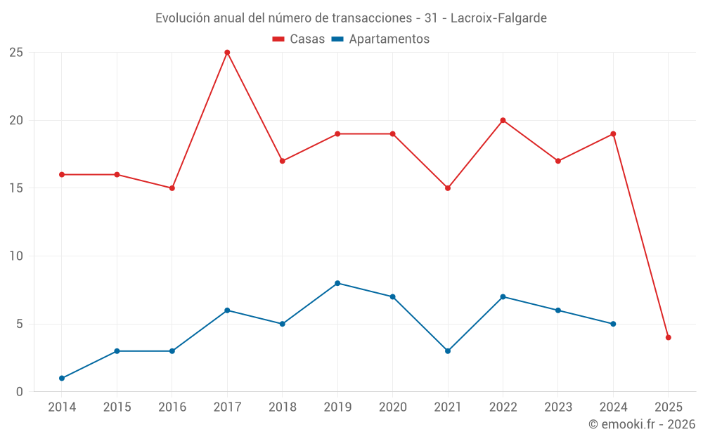 El precio mediano en las 31 transacciones de casas de los últimos 24 meses en la comuna de Lacroix-Falgarde fue de 3 444 € por metro cuadrado para un valor patrimonial medio de 480 000 €. Durante este período el 60% de las transacciones estuvieron entre 2 621 y 4 027 € por metro cuadrado (del 2º al 8º decil).