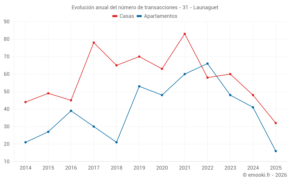 El precio mediano en las 40 transacciones de apartamentos de los últimos 12 meses en la comuna de Launaguet fue de 2 478 € por metro cuadrado para un valor patrimonial medio de 132 500 €. Durante este período el 60% de las transacciones estuvieron entre 2 144 y 2 882 € por metro cuadrado (del 2º al 8º decil).