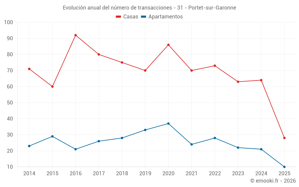 El precio mediano en las 28 transacciones de casas de los últimos 6 meses en la comuna de Portet-sur-Garonne fue de 2 666 € por metro cuadrado para un valor patrimonial medio de 252 700 €. Durante este período el 60% de las transacciones estuvieron entre 2 166 y 3 332 € por metro cuadrado (del 2º al 8º decil).