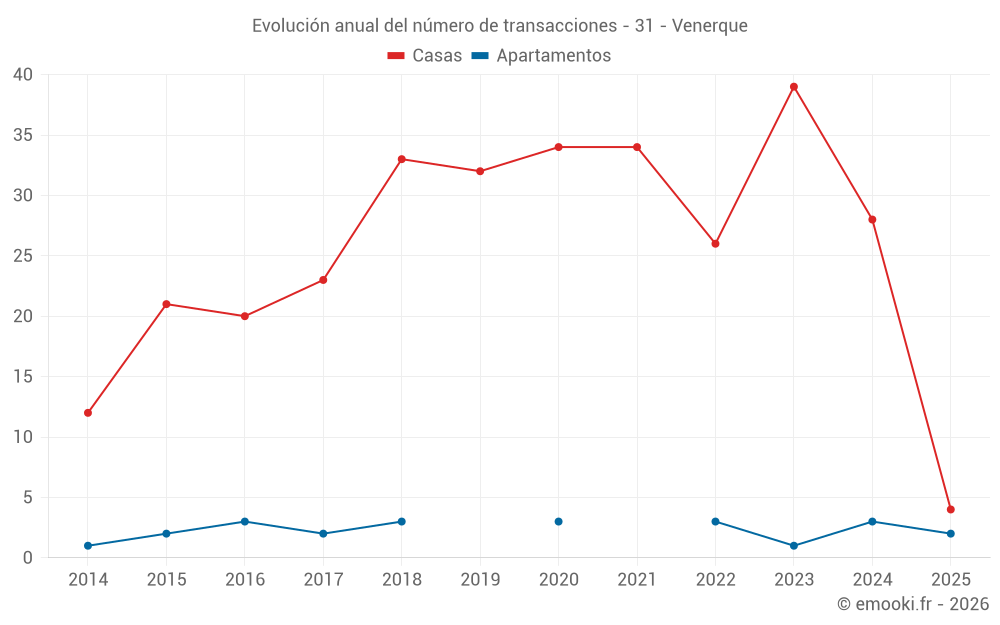 El precio mediano en las 16 transacciones de casas de los últimos 12 meses en la comuna de Venerque fue de 2 914 € por metro cuadrado para un valor patrimonial medio de 301 482 €. Durante este período el 60% de las transacciones estuvieron entre 2 537 y 3 548 € por metro cuadrado (del 2º al 8º decil).