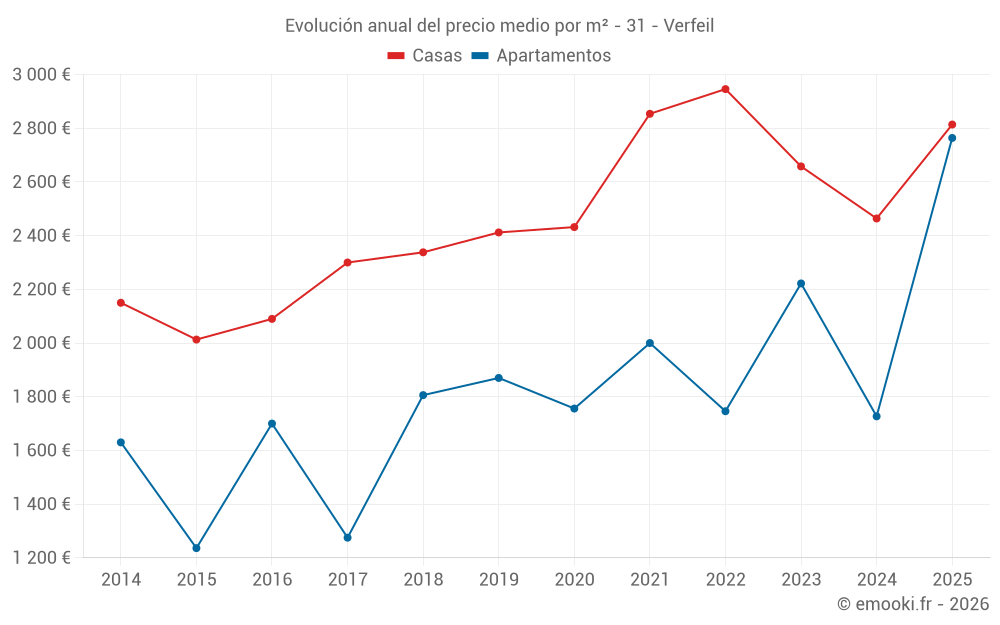 El precio mediano en las 28 transacciones de casas de los últimos 12 meses en la comuna de Verfeil fue de 2 530 € por metro cuadrado para un valor patrimonial medio de 276 342 €. Durante este período el 60% de las transacciones estuvieron entre 2 250 y 3 243 € por metro cuadrado (del 2º al 8º decil).