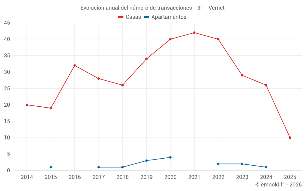 El precio mediano en las 24 transacciones de casas de los últimos 12 meses en la comuna de Vernet fue de 2 873 € por metro cuadrado para un valor patrimonial medio de 256 250 €. Durante este período el 60% de las transacciones estuvieron entre 2 211 y 3 151 € por metro cuadrado (del 2º al 8º decil).