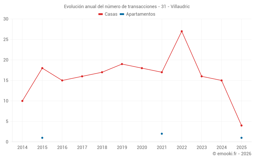 El precio mediano en las 27 transacciones de casas de los últimos 24 meses en la comuna de Villaudric fue de 2 315 € por metro cuadrado para un valor patrimonial medio de 270 000 €. Durante este período el 60% de las transacciones estuvieron entre 1 723 y 2 938 € por metro cuadrado (del 2º al 8º decil).