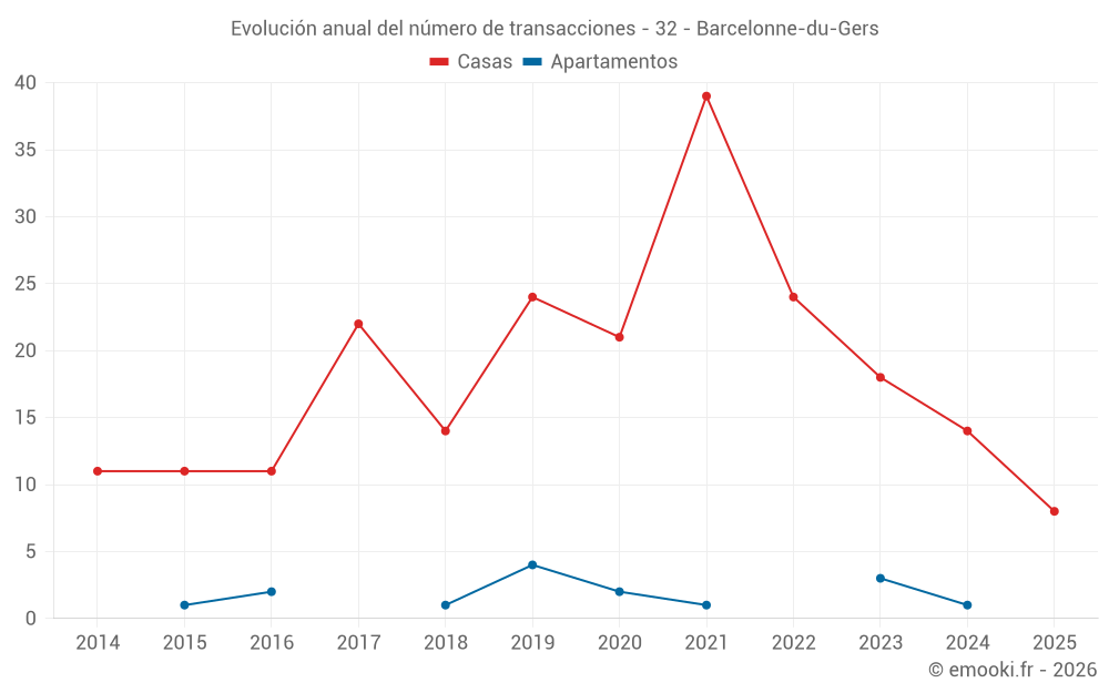 El precio mediano en las 17 transacciones de casas de los últimos 12 meses en la comuna de Barcelonne-du-Gers fue de 1 296 € por metro cuadrado para un valor patrimonial medio de 153 000 €. Durante este período el 60% de las transacciones estuvieron entre 998 y 1 831 € por metro cuadrado (del 2º al 8º decil).
