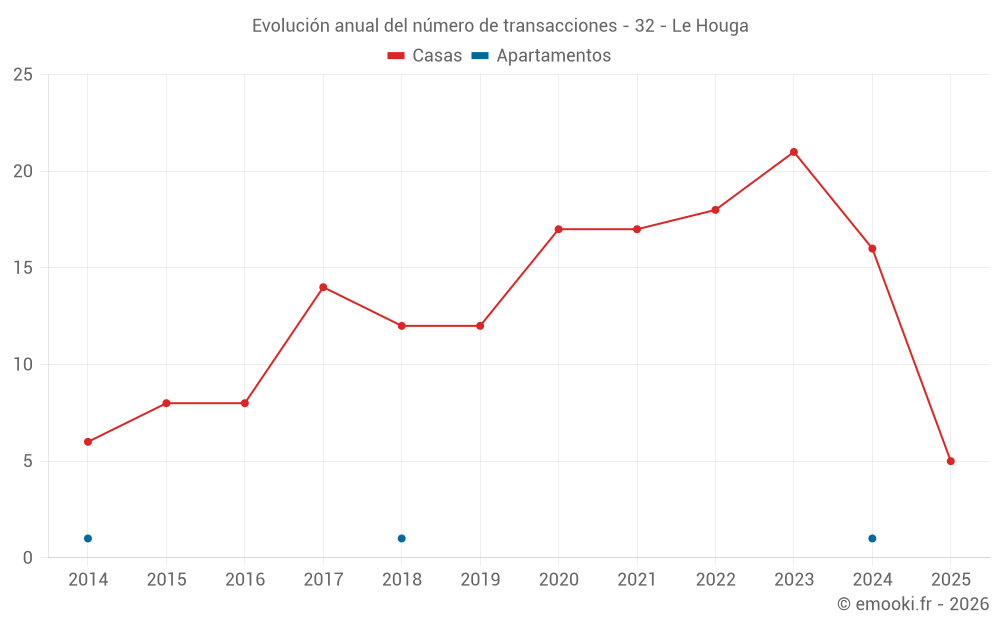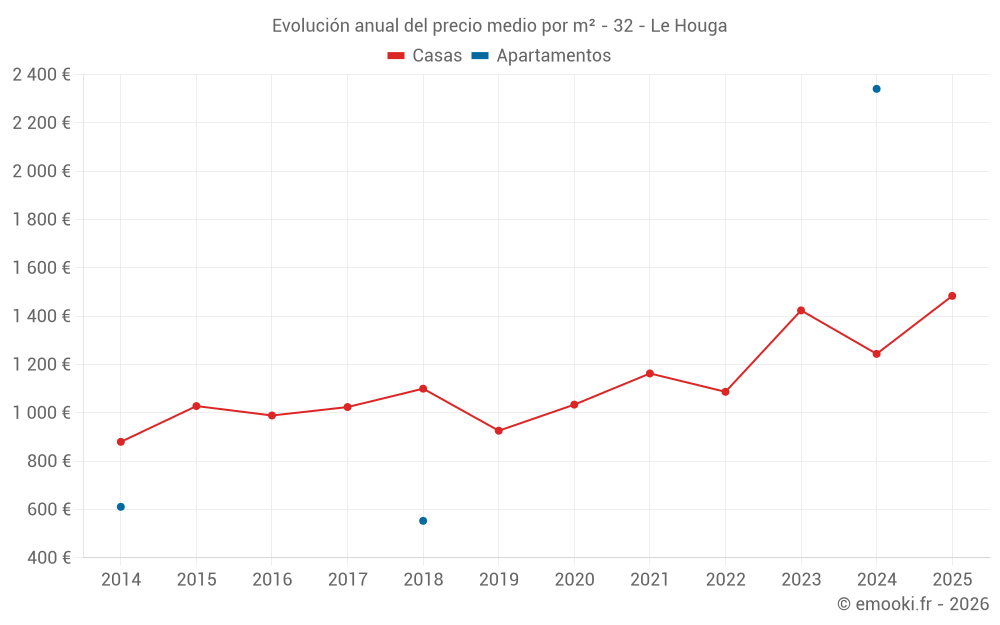 El precio mediano en las 34 transacciones de casas de los últimos 24 meses en la comuna de Le Houga fue de 1 326 € por metro cuadrado para un valor patrimonial medio de 139 000 €. Durante este período el 60% de las transacciones estuvieron entre 990 y 1 664 € por metro cuadrado (del 2º al 8º decil).