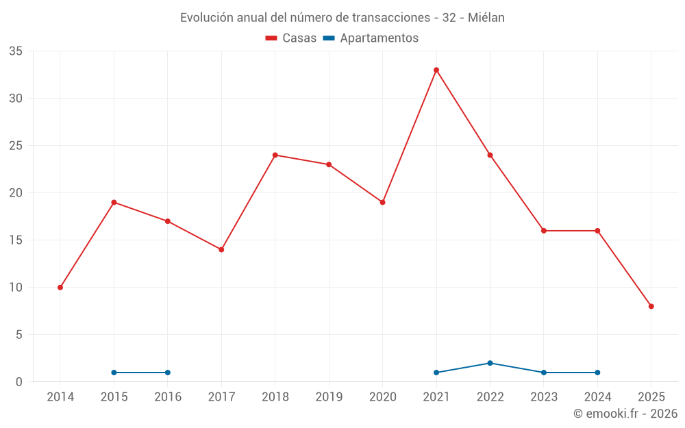 El precio mediano en las 16 transacciones de casas de los últimos 12 meses en la comuna de Miélan fue de 1 476 € por metro cuadrado para un valor patrimonial medio de 122 000 €. Durante este período el 60% de las transacciones estuvieron entre 691 y 1 837 € por metro cuadrado (del 2º al 8º decil).