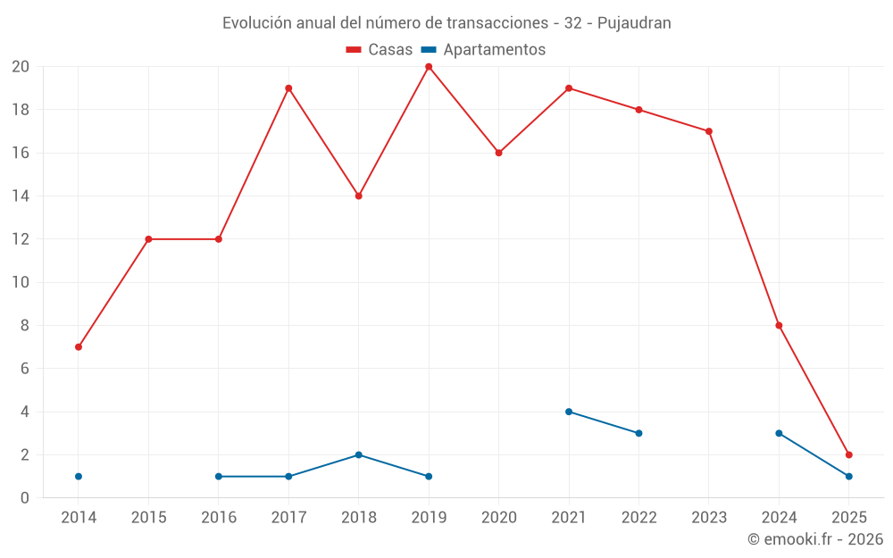 El precio mediano en las 22 transacciones de casas de los últimos 24 meses en la comuna de Pujaudran fue de 3 004 € por metro cuadrado para un valor patrimonial medio de 259 750 €. Durante este período el 60% de las transacciones estuvieron entre 1 647 y 3 469 € por metro cuadrado (del 2º al 8º decil).