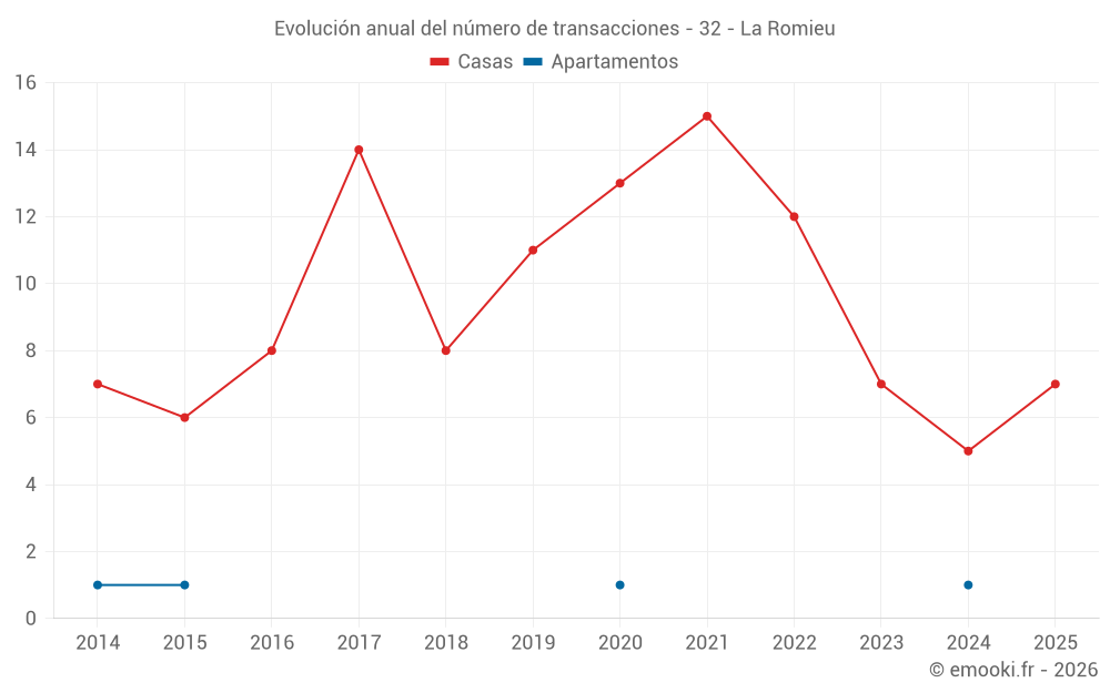 El precio mediano en las 17 transacciones de casas de los últimos 24 meses en la comuna de La Romieu fue de 1 828 € por metro cuadrado para un valor patrimonial medio de 210 800 €. Durante este período el 60% de las transacciones estuvieron entre 1 076 y 2 478 € por metro cuadrado (del 2º al 8º decil).