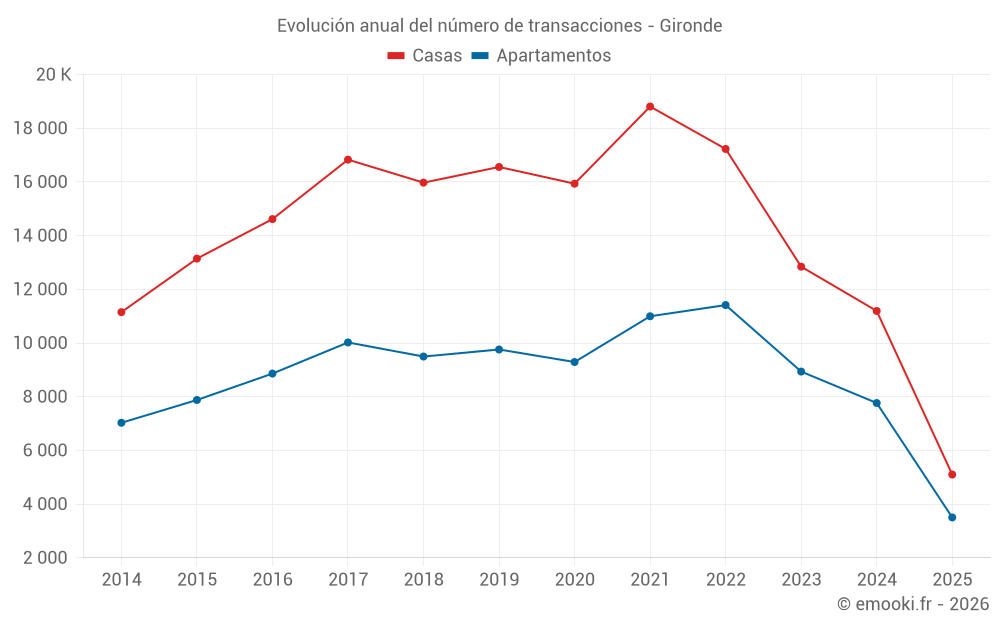 El precio mediano en las 1499 transacciones de apartamentos de los últimos 3 meses en el departamento de Gironde fue de 3 619 € por metro cuadrado para un valor patrimonial medio de 178 740 €. Durante este período el 60% de las transacciones estuvieron entre 2 598 y 4 769 € por metro cuadrado (del 2º al 8º decil).