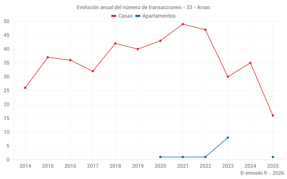 El precio mediano en las 41 transacciones de casas de los últimos 12 meses en la comuna de Arsac fue de 3 125 € por metro cuadrado para un valor patrimonial medio de 330 000 €. Durante este período el 60% de las transacciones estuvieron entre 2 620 y 3 681 € por metro cuadrado (del 2º al 8º decil).