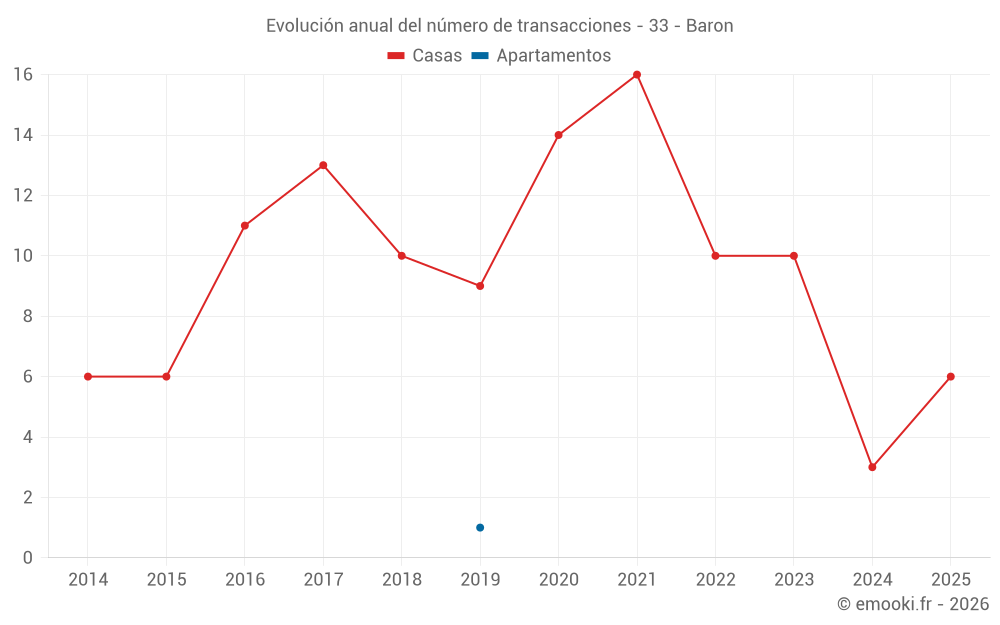 El precio mediano en las 17 transacciones de casas de los últimos 24 meses en la comuna de Baron fue de 2 523 € por metro cuadrado para un valor patrimonial medio de 220 000 €. Durante este período el 60% de las transacciones estuvieron entre 1 235 y 3 351 € por metro cuadrado (del 2º al 8º decil).