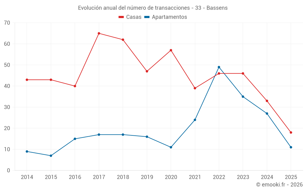 El precio mediano en las 18 transacciones de casas de los últimos 6 meses en la comuna de Bassens fue de 2 830 € por metro cuadrado para un valor patrimonial medio de 228 208 €. Durante este período el 60% de las transacciones estuvieron entre 2 453 y 3 377 € por metro cuadrado (del 2º al 8º decil).